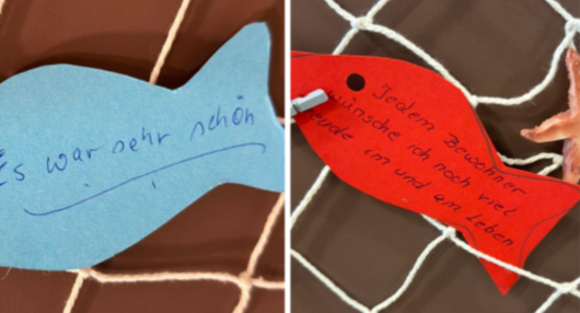 Ein Meer voller positiver Energie beim Sommerfest in der Lavendio Seniorenresidenz Melle. Bei dem liebevoll gestalteten Deko-Fischernetz konnten Gäste und Bewohner*innen ihre Gedanken und guten Wünsche auf kleinen Papierfischen hinterlassen. Jeder kleine Papierfisch trug eine schöne Botschaft.