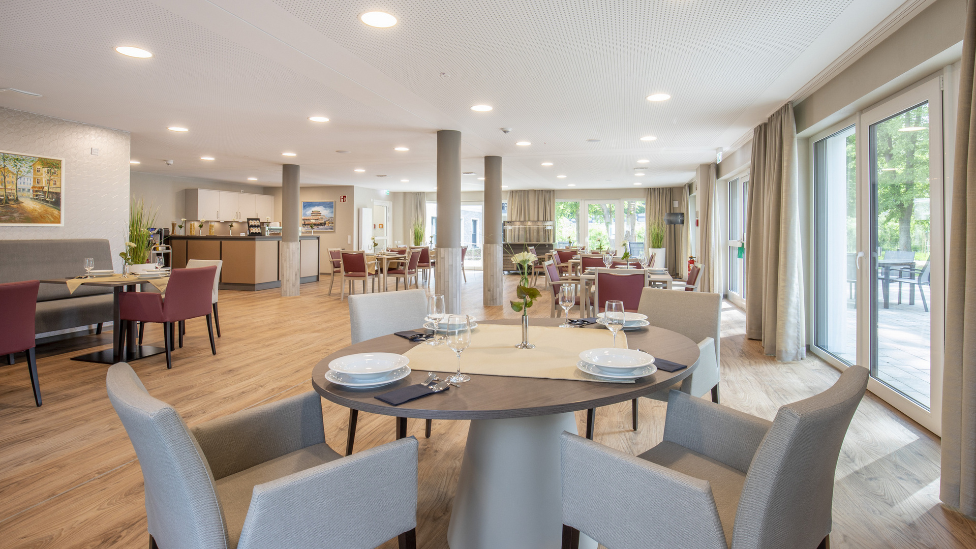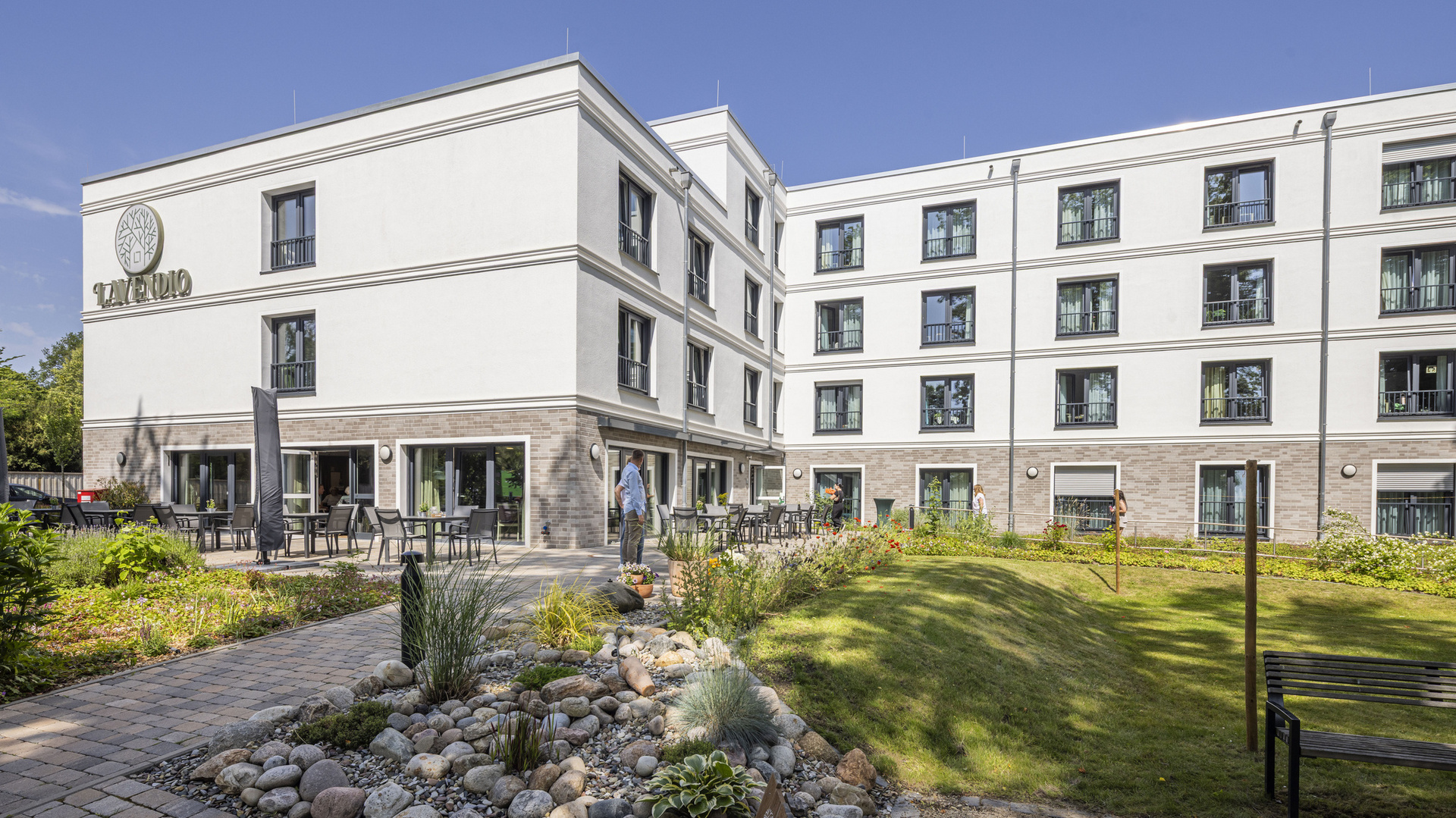 Es kann von Bewohner*innen und Angehörigen, aber auch von Besucher*innen oder Anwohner*innen aus dem näheren Umfeld genutzt werden. Die weitläufige Sonnenterrasse ist direkt angegliedert und bietet bei schönem Wetter einen herrlichen Platz für ein gemütliches Kaffeetrinken. Die großzügige Gartenanlage besticht durch für die Region typische Pflanzen und Bäume. Hochbeete mit Kräutern werden für die hauseigene Küche genutzt und dienen auch als Sinnesgarten - ein Raum für Entspannung und Begegnung, der allen offensteht.